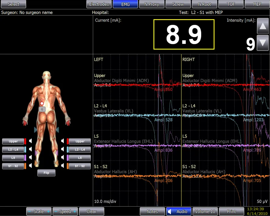 NIM-Eclipse SD es un sistema de neuromonitoreo de 8 canales destinado a todo tipo de cirugías de columna. Este sistema permite al cirujano iniciar, controlar y realizar estudios neurofisiológicos directamente desde la zona estéril.